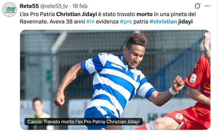 La notizia di un lutto è arrivata purtroppo anche per il calcio italiano. E’ stato ritrovato morto nella notte tra martedì 17 e mercoledì 18 febbraio, l’ex calciatore Christian Jidayi. Cresciuto nel settore giovanile del Cesena, club con il quale ha esordito in Serie B nella stagione 2007-2008, Jidayi ha indossato anche le maglie di Mantova, Bellaria Igea Marina, Bassano, Lecco e Pro Patria. Anche suo fratello William è stato calciatore con un passato tra Serie B e Serie C con Sassuolo, Padova, Ravenna, Juve Stabia e Aveltino.